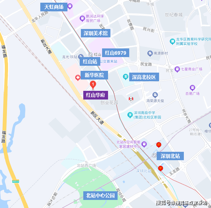 红山华府位于新区大道与民宝路交汇处,距离地铁4号线红山站约400米,旁边即是深圳新华医院。红山板块是龙华的中央居住区,龙华最热门的置业区域,片区配套完善,居住氛围浓厚。
