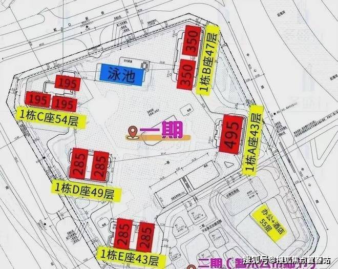 1A栋3梯1户,共37套均为490㎡5+5卫+1,总高165.77M,总高43F