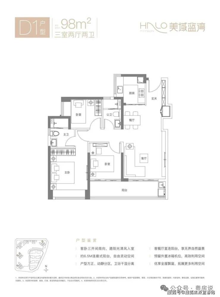 98㎡的3房2厅2卫,D1户型,经典竖厅格局,客厅3.7米开间,LDKB一体化设计,S墙设计预留冰箱卡槽位,动静分区,客厅连接次卧出6.5米长的大阳台,U型厨房,卫生间干湿分离,得房率约80.12%(不含赠送),西南或东北朝向。