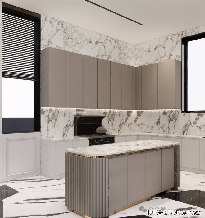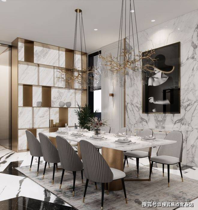 The kitchen area is designed with a migratory flow line, centered around the island platform, allowing "taking→washing→cutting→frying→serving" to be in one flow line, avoiding a sense of enclosed space.The marble in the dining area paired with a light luxury chandelier showcases the high-end Italian style of light luxury, exuding a sense of ceremony.