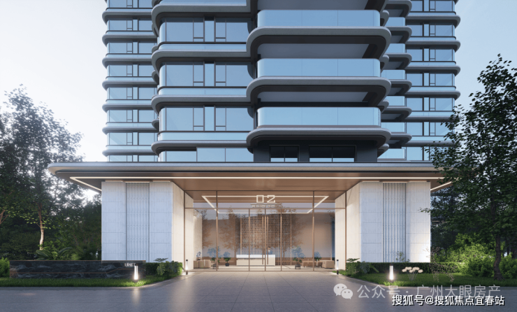 比如,住宅外立面采用弧形转角设计,严选LOW-E玻璃与金属铝板,构成高颜值的冠冕式屋顶,辨识度很高。这类外立面往往工艺难度更大,成本更高,常见于10万+/㎡的豪宅。