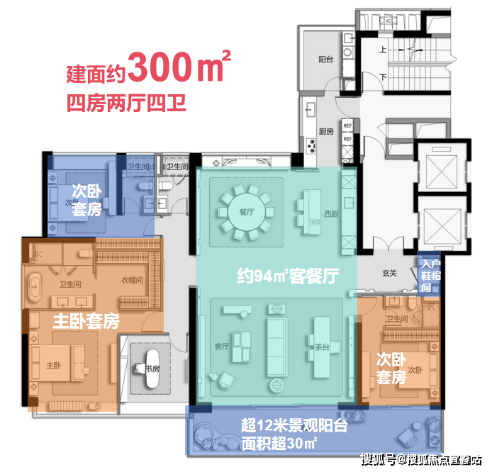 以建面约300㎡的宽幕大平层为例,景观视野全小区最佳,是高端圈层的首选户型。