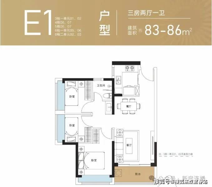 83平:3房2厅1卫,西南/东南/东北,套内使用率73.52%(不包含赠送)