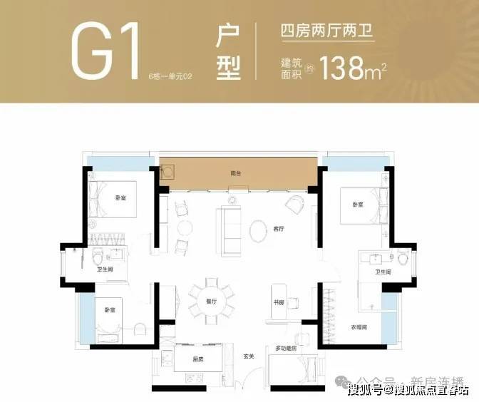 138平:4+1房2厅2卫,正东朝向,套内使用率73.52%(不包含赠送)