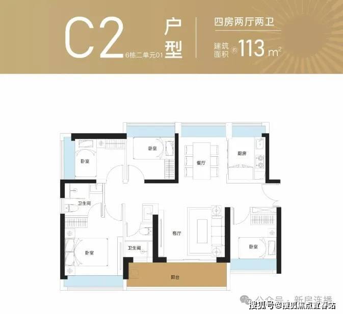 113平:4房2厅2卫,南北通透,套内使用率73.52%(不包含赠送)