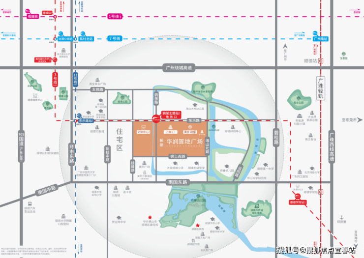 华润置地顺德悦府,世界500强华润置地布局大良东区的重要一子,选址顺德大良街道云近东区,是在建佛山地铁3号线驹荣北路站地铁上盖,同时也是顺德大良规模最大、唯一地铁上盖的TOD城市综合体项目。