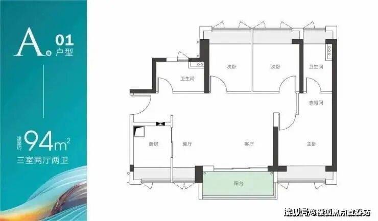 A座01户型-建面约94m² 三房两厅两卫