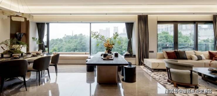 像建面约260㎡的无界公区:以70㎡LDKB pro的设计,打破客餐厨阳台四区界限,以禅意茶桌为中轴,一侧是四代同堂的家宴场所,另一侧则是家庭高频互动的空间。