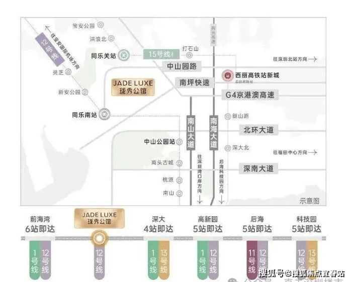项目周边聚集深圳头部产业资源:西侧为科技园(腾讯、大疆等科技企业总部),东接前海金融中心,南靠蛇口自贸区,北邻留仙洞战略性新兴产业总部基地。区域内以高新技术、金融、总部经济为主导,吸引大量科技从业者及金融精英,形成高净值人群聚集效应。同乐片区未来或承接南山产业外溢,成为职住平衡的重要节点。