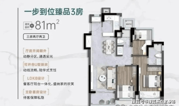 81㎡的3房2厅2卫 ,设计的是竖厅格局,客厅3.05米开间,LDKB一体化,S墙设计预留冰箱卡槽位,动静分区,U型厨房,卫生间三段式干湿分离还带1个设备平台, 得房率约91%(包含赠送),实用面积约73.71m² ,正东或正南朝向。