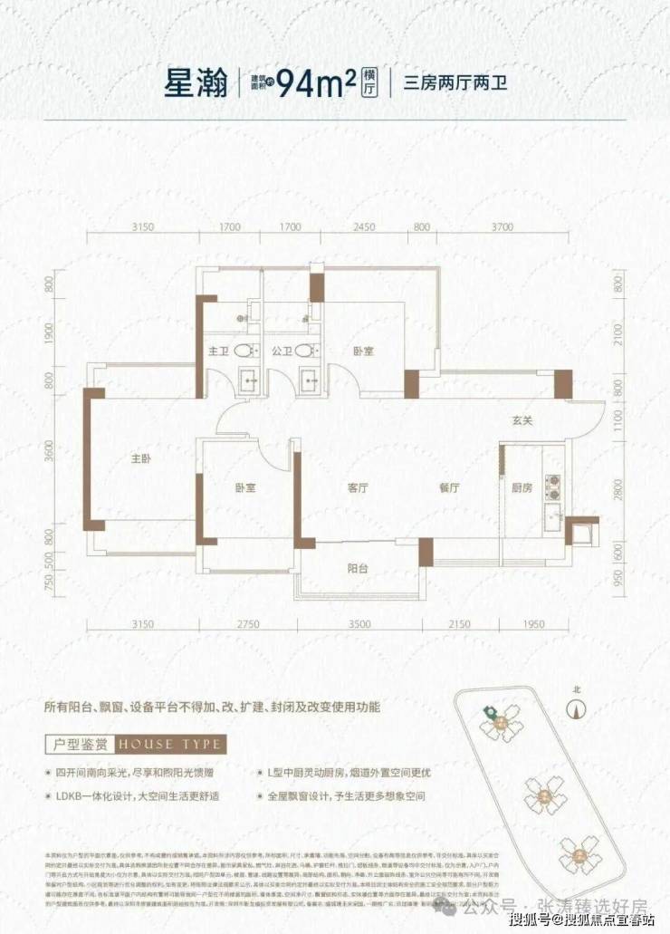 94㎡的3房2厅2卫(-2),设计的是横厅南北通透格局,独门独户,进门入户玄关,客餐厅5.7米开间,LDKB一体化,全屋10面飘窗,主卧南北通,U型厨房,卫生间干湿分离,得房率约93.73%(包含赠送),阳台主朝西南向。