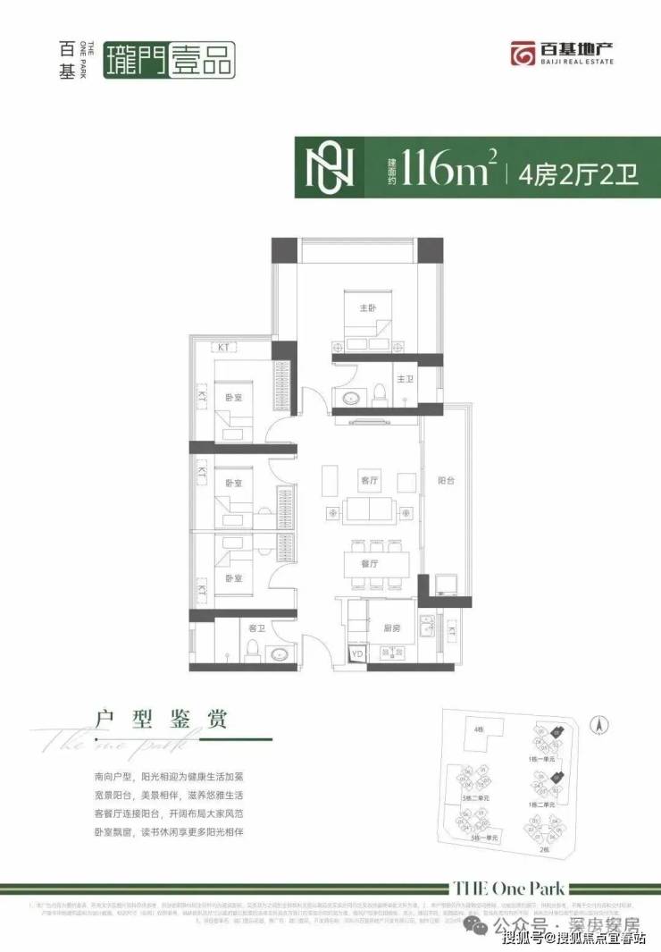 116㎡的4房2厅2卫,设计的是横厅南北通透格局,进门入户玄关,客餐厅6米开间,LDKB一体化设计,五开间朝南,4个卧室分别做到了3.775米/3.2米/2.6米/2.575米的宽度,主卧三面飘窗,6米长的大阳台,L型厨房,卫生间干湿分离,得房率:70.65%(不含赠送),阳台主朝东南向。