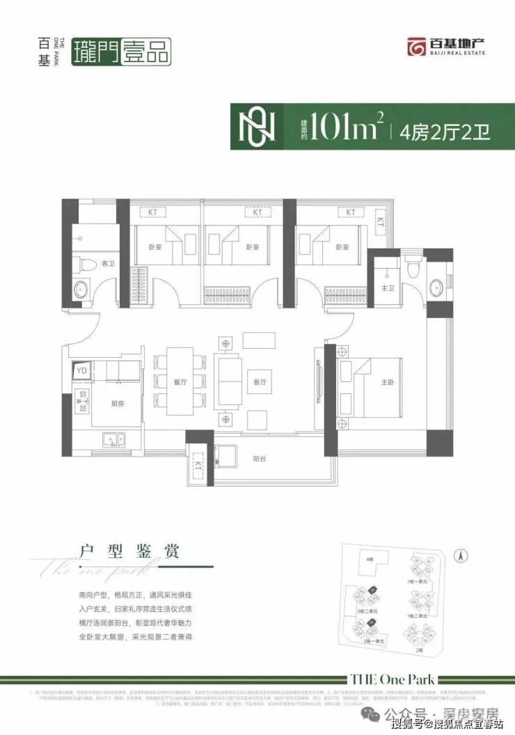 101㎡的4房2厅2卫,设计的是横厅南北通透格局,进门入户玄关,客餐厅5.55米开间,LDKB一体化设计,四开间朝南,4个卧室分别做到了3.85米/2.6米/2.4米/2.35米的宽度,主卧270°双飘窗,U型厨房,卫生间干湿分离,得房率:71.29%(不含赠送),阳台主朝东南向。