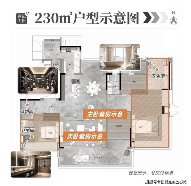 休憩区、步入式衣柜、多功能区、L型大飘窗等场景都有规划,居住尺度完全是按照豪宅的做法,仪式感和实用性满分。
