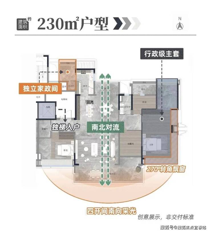 230平户型拥有私家电梯厅、双主套、独立佣人房、南北对流、LDKB大方厅、主卧L型270°飘窗等,大大提升了整体的空间体验。