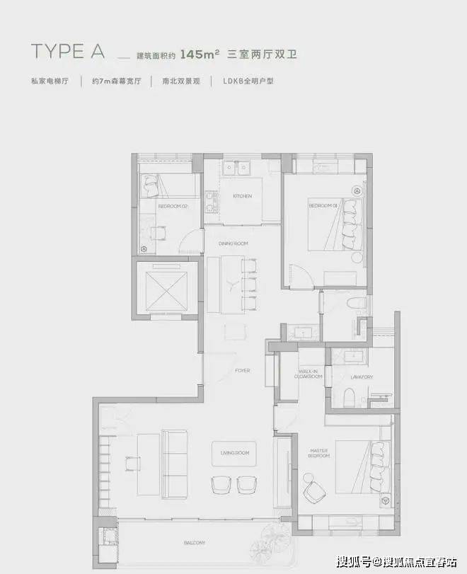 • 145㎡三房两厅两卫:餐厨一体化设计,7.1米南向宽厅,LDK全明布局,适合年轻家庭。