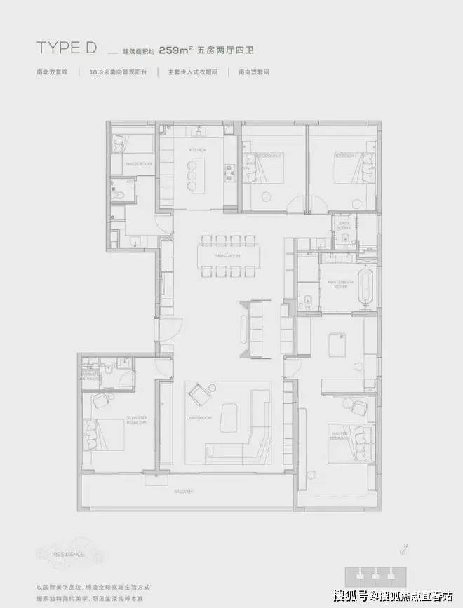 • 264㎡五房四卫:10.3米南向景观阳台,主套步入式衣帽间,6.6米方厅,专属家政空间。