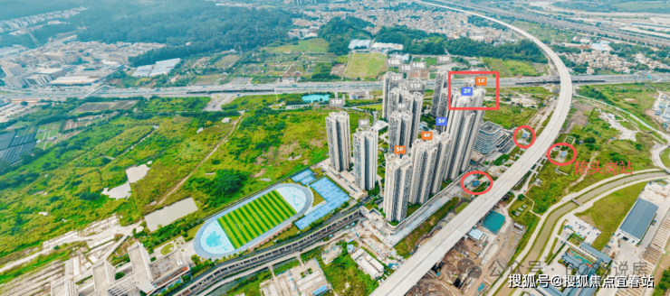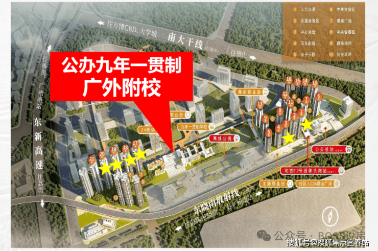 项目主要是分为北区和南区开发,上图的左边是北区,右边是南区,两区中间是配建的幼儿园和9年制广外附学校,地铁站口和商业主要集中在南区楼下。