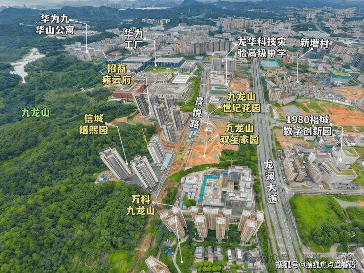 招商雍云府,位于深圳市龙华区福城街道九龙山社区龙澜大道旁,地处九龙山智能科技城核心区,规划范围9.81平方公里,是深圳市重点区域之一。项目紧邻华为新基地(直线距离约50米)和美团大湾区总部(约200米),处于龙华区福城街道与观澜街道交界处,西侧紧邻大水坑社区公园,北侧为九龙山风景区,生态资源丰富。