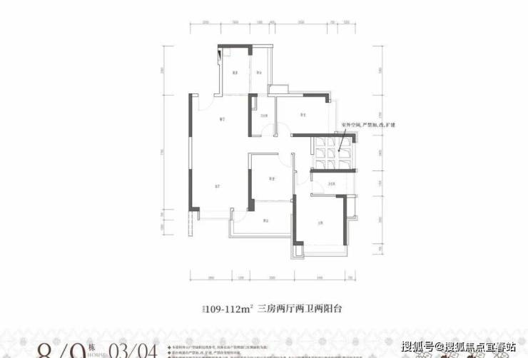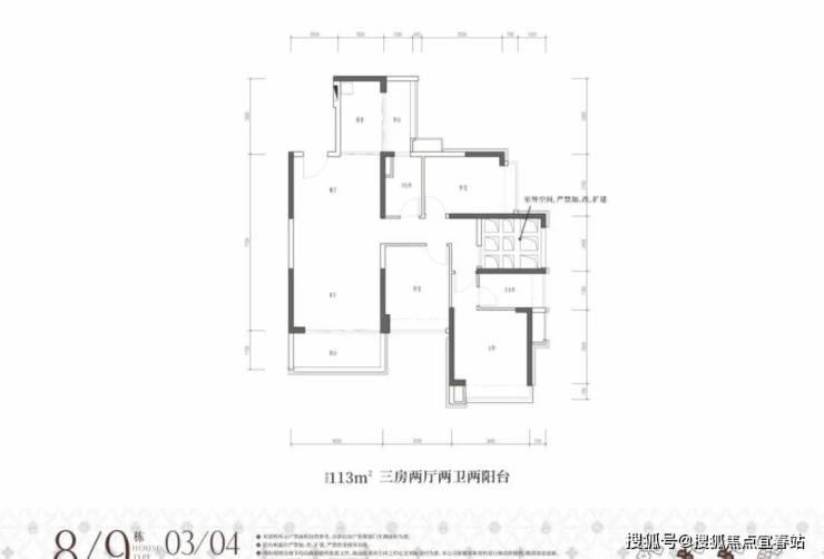 8/9栋03/04户型,建面约109-113㎡,原始结构是三房两厅两阳台,奇数层客厅正出阳台,偶数层客厅侧出阳台,奇数偶数层厨房都有生活阳台,且主卫与次卧之间有一块镂空的地方,搭板并入主卧做书房或者单独做儿童房使用都可以,不能搭的话结构也还说的过去,就是得房率会低一点。