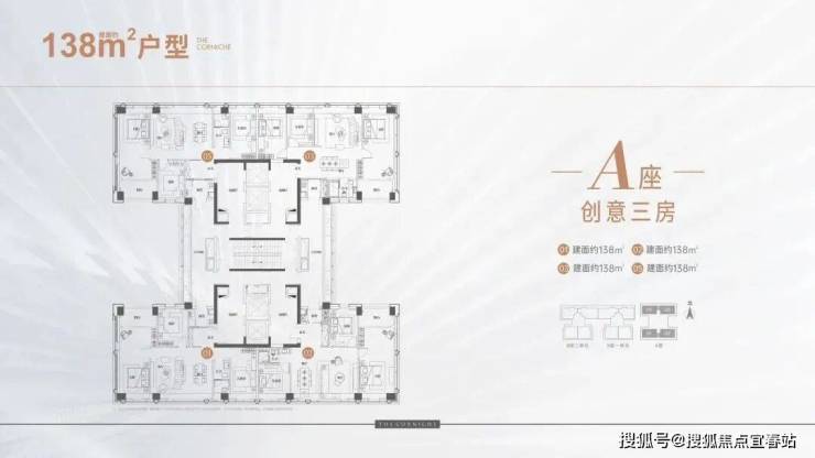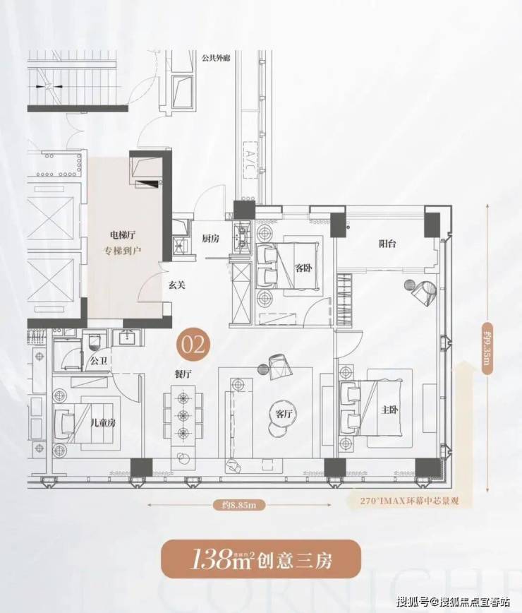.天宸138㎡户型,四梯四户,专梯入户,整个框架可以灵活打造,大面积没有承重墙和承重柱,可以随心设计自己的家。电梯厅加厨房,外部连廊加半个阳台算赠送面积,所以空间利用还算挺高。