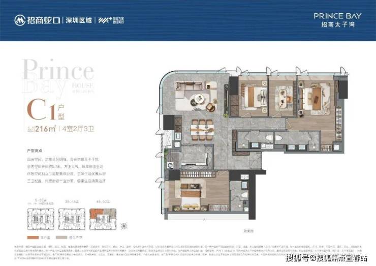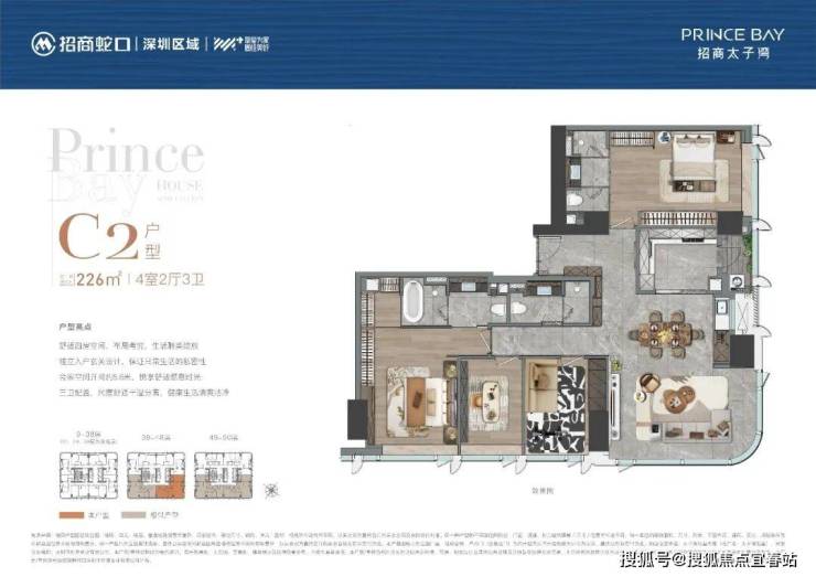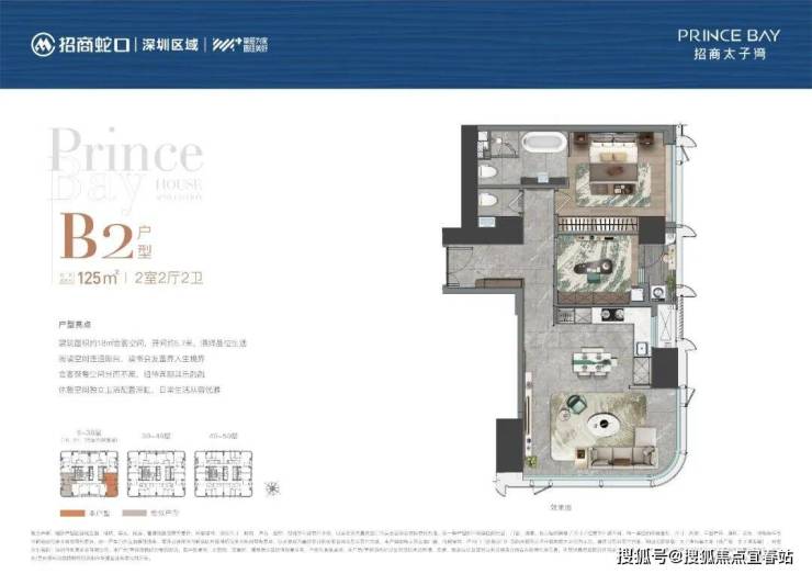 项目建筑总层数50层,公寓位于9-50层(1-8层为商业),建筑高度194米。项目采用国际知名设计单位10Design、ACLA负责建筑与景观设计,以水中动态的倒影为创作灵感,打造优雅而具有辨识度的外立面。太子湾片区规划总建筑面积约170万㎡,总占地约69万㎡,汇集办公、居住、商业、艺术中心、酒店等多元业态。