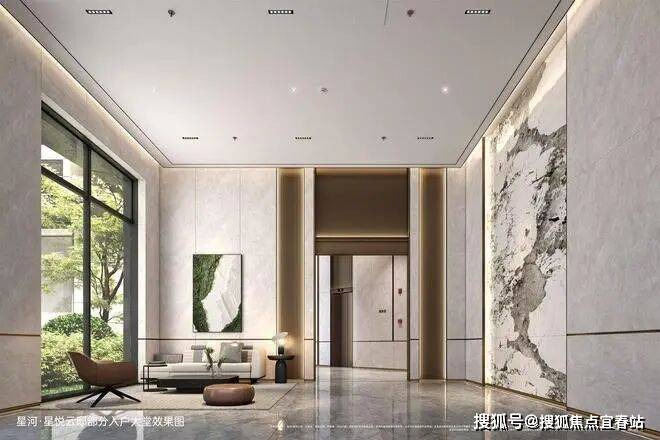 约6米舒展层高采光大堂,均有采光幕墙;楼栋大堂专属岩板背景墙,潘多拉奢石纹理,内嵌隐藏式光源,设备巧妙暗藏式处理;充分从人性化角度出发打造舒适休息区、会客厅。