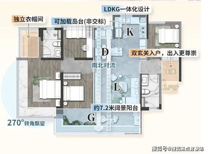 建面100㎡四房两卫:海珠罕见百平内正四房,4.1米方正厅堂,7.2米大阳台,独立主卧套间,270°转角飘窗提升采光与景观视野。