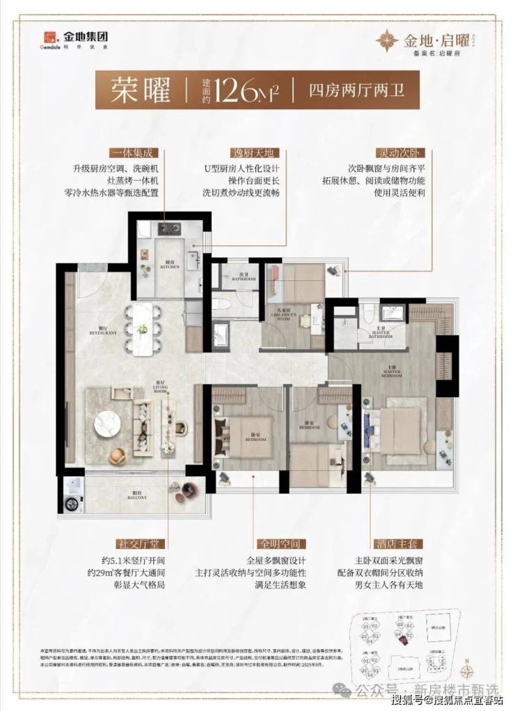 126㎡的4房2厅2卫,设计的是经典竖厅格局,客厅5.1米开间,LDKB一体化设计约29平大方厅,动静分区,四开间朝南,主卧270°转角飘窗,U型厨房,公卫三段式干湿分离,得房率约90%(包含赠送),客厅出5.1米长的大阳台,西南朝向。