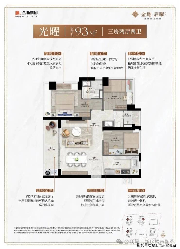 93㎡的3房2厅2卫,2栋1/2/3单元01户型,设计的是横厅南北通透格局,客餐厅5.7米开间,LDK一体化方厅约23平,主卧+次卧270°转角飘窗,U型厨房,公卫三段式干湿分离,得房率约90%(包含赠送),客厅连接餐厅出5.7米长的大阳台,西南或东南朝向。
