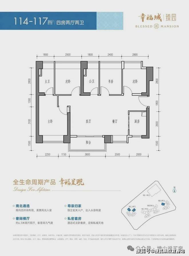 114-117㎡的4房2厅2卫,设计的是横厅南北通透格局,进门入户玄关,客餐厅6.3米开间,LDKB一体化设计,全屋8个飘窗面,4个卧室分别做到了主卧15.35㎡/次卧9.86㎡/次卧9.4㎡/次卧8.16㎡(包含墙体飘窗),U型厨房,卫生间干湿分离,得房率约84.87-87.1%(包含赠送),阳台主朝西南或东南向。