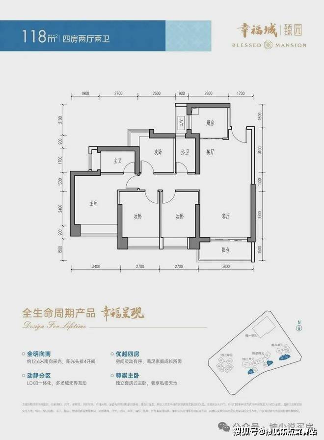 118㎡的4房2厅2卫,设计的是经典竖厅格局,进门入户玄关,客厅3.8米开间,LDKB一体化设计,动静分区,四开间朝南,4个卧室分别做到了主卧16.18㎡/次卧10.53㎡/次卧10.53㎡/次卧7.66㎡(包含墙体飘窗),U型厨房,卫生间干湿分离,得房率约84.02%(包含赠送),东南朝向。