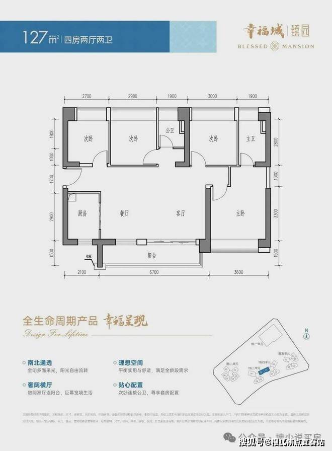 127㎡的4房2厅2卫,设计的是横厅南北通透格局,进门入户玄关,客餐厅6.7米开间,LDKB一体化设计,全屋6个飘窗面,4个卧室分别做到了主卧16.9㎡/次卧10.2㎡/次卧9.86㎡/次卧9.1㎡(包含墙体飘窗),客餐厅出6.7米长的大阳台,U型厨房,卫生间干湿分离,得房率约87.72%(包含赠送),阳台主朝东南向。