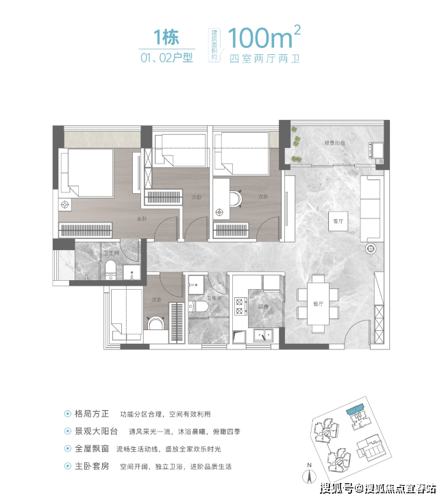 ⑦:建面约100㎡是四房两厅两卫户型,结构方正,功能间的布局也比较合理,动静分区、实用性比较强,唯一明显槽点是西北朝向。