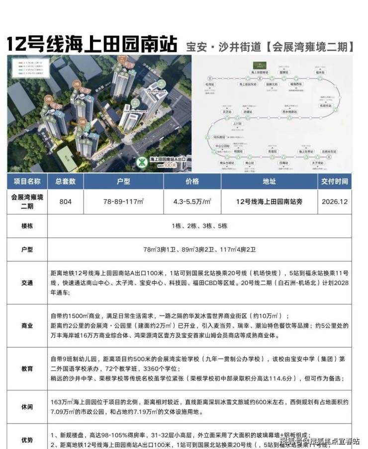 距离地铁12号线海上田园南站A出口100米,1站可到国展北站换乘20号线(机场快线),5站到福永站换乘11号线。