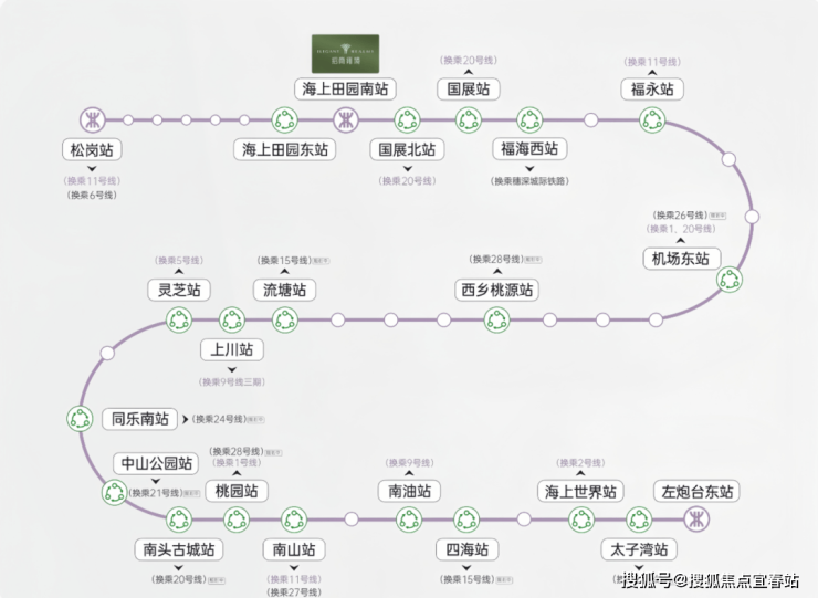 <交通>:快速通达南山中心、太子湾、宝安中心、科技园、福田CBD等区域。20号线二期(白石洲-机场北)计划2028年通车;