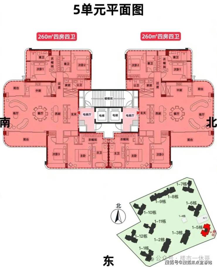 格局:4+1房三卫,东南朝向的户型看:海景、摩天轮、城市等复合景观,西南朝向的户型可以看小区的园林景观。