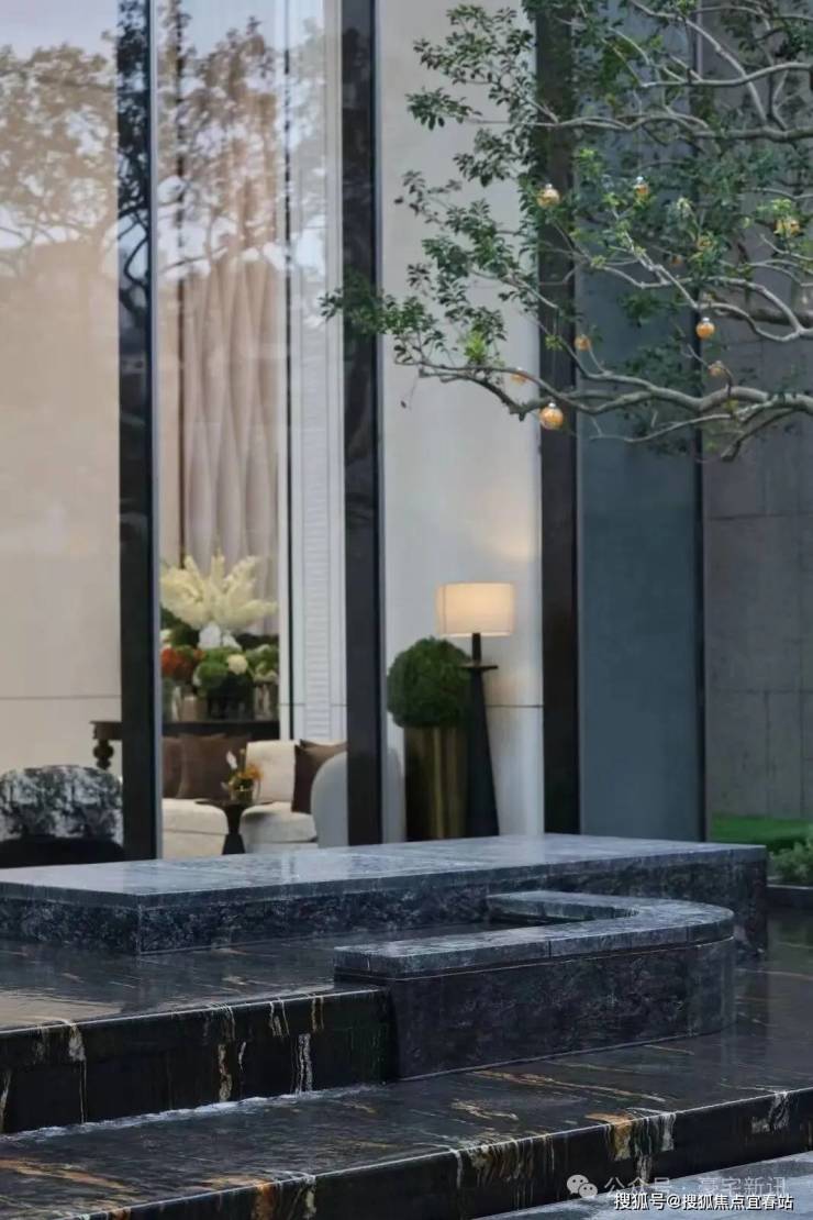 跌水水景石材采用拿破仑黑金以及铂金钻大理石,通过石材的天然质感和水的流动,实现刚柔并济的美学平衡。