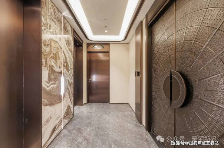 尊崇高定大堂,精研艺术与生活交融之美,雕琢金属与石材材质的自然奢华,营造艺术感的归家体验,遇鉴居者精奢高雅的审美。