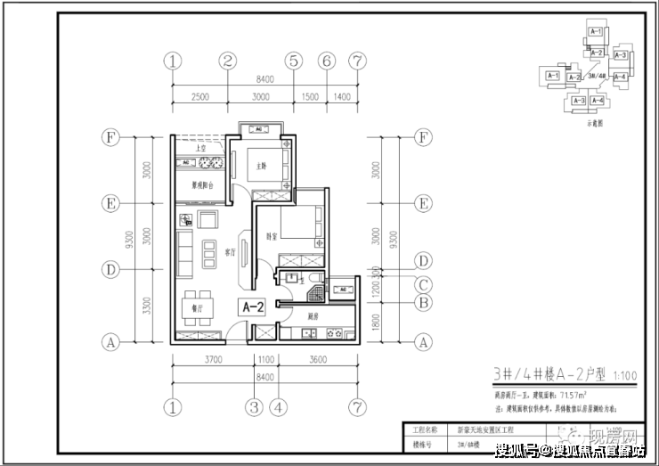 3#、4#号楼A2户型71.57㎡(两房两厅一卫)