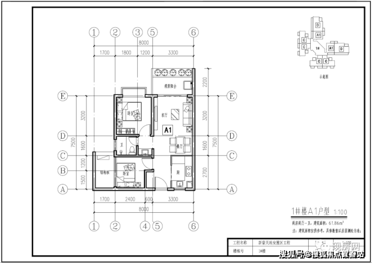1#号楼A1户型61.86㎡(两房两厅一卫)