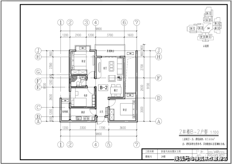 2#号楼B2户型82.60㎡(三房两厅一卫)