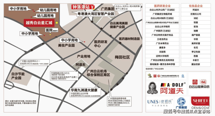 广州大健康产业基地:投资200亿,规模约等于22个广钢新城,已有何济公、明兴制、广药集团、和黄中药等29家知名健康产业企业入驻,健康城整体包含医药研制、职业教育、健康服务和健康养生四大功能片区;