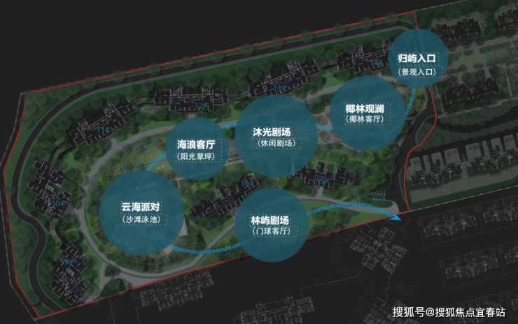 以“林屿” 为主线贯穿园林始终,结合度假生活的需求和海岛的居住文化、自然资源景观等,园林八大主题空间串联,包括椰林嘉观澜,沐光剧场、海浪客厅等场景交织,兼顾功能性和美观性,为湾区园林生活树立一个新标准。