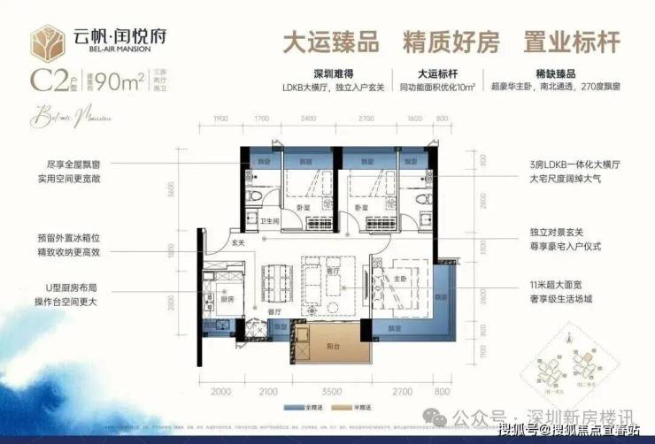 90㎡的3房2厅2卫,C2户型,设计的是横厅南北通透格局,进门入户玄关,客餐厅5.6米开间,LDKB一体化,四开间朝南,动静分区,主卧270°无柱飘窗,分别做到了主卧15.41㎡/次卧9.72㎡/次卧8.64㎡(包含墙体飘窗),U型厨房,卫生间干湿分离,得房率约79%(不含赠送),阳台6.65㎡东南朝向。套内面积71.1㎡+赠送面积16.69㎡=实用面积87.79㎡,加上赠送后得房率约97.54%。