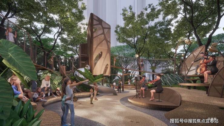 打造元气健身营地空间、自然水岸泳池、达尔文营地游乐场、流水庭院花园等四大主题花园。