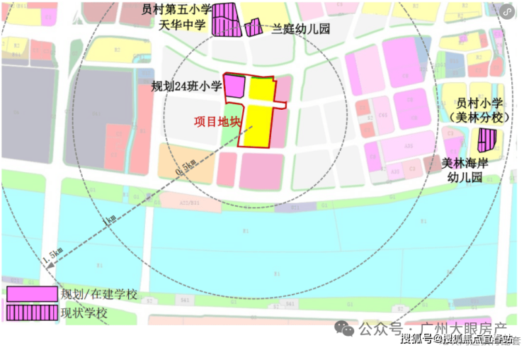 地块1.5公里范围内有员村第五小学、天华中学、兰庭幼儿园、员村小学(美林分校)、美林海岸幼儿园等。