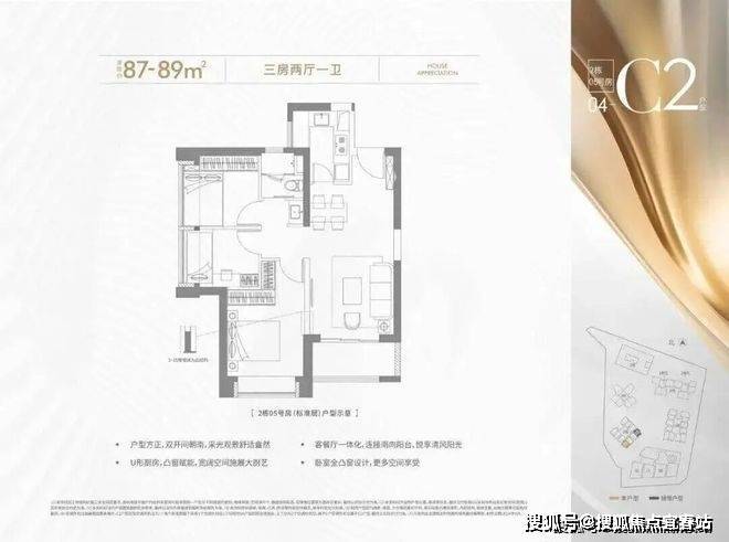 87-89㎡的3房2厅1卫,设计的是竖厅格局,进门入户玄关,客厅3.35米开间,LDKB一体化设计,进深7.2米,U型厨房,卫生间三段式分离,得房率约72.28%(不含赠送),西南或东南朝向。