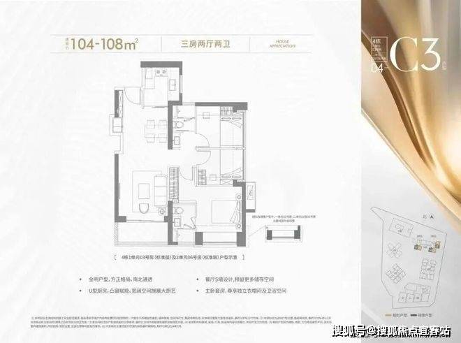 104-108㎡的4房2厅2卫,设计的是竖厅格局,进门入户玄关,客厅3.6米开间,LDKB一体化设计,进深8.7米,S墙设计预留冰箱卡槽位,三开间朝南,主卧套房设计,U型厨房,公卫三段式分离,得房率约72.45%(不含赠送),正南或正东朝向。