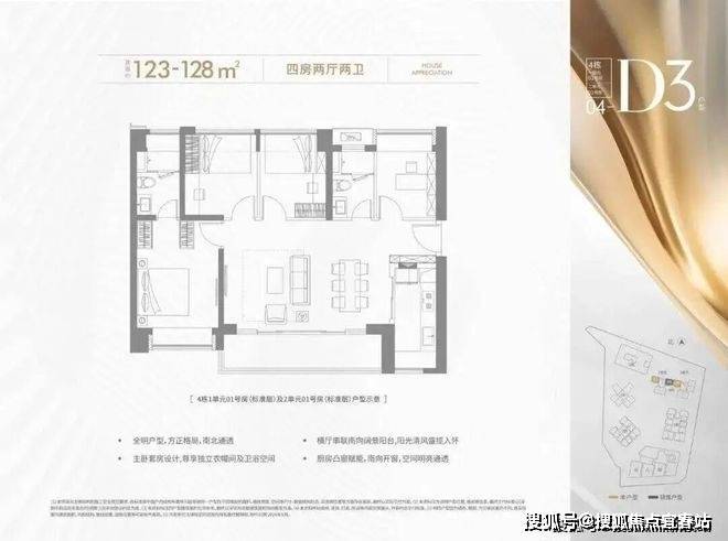 123-128㎡的4房2厅2卫,设计的是横厅南北通透格局,进门入户玄关,客餐厅6.6米开间,LDKB一体化设计,四开间朝南,主卧套房设计,6.6米超长观景阳台,U型厨房,卫生间干湿分离,得房率约72.45%(不含赠送),阳台主朝正南向。